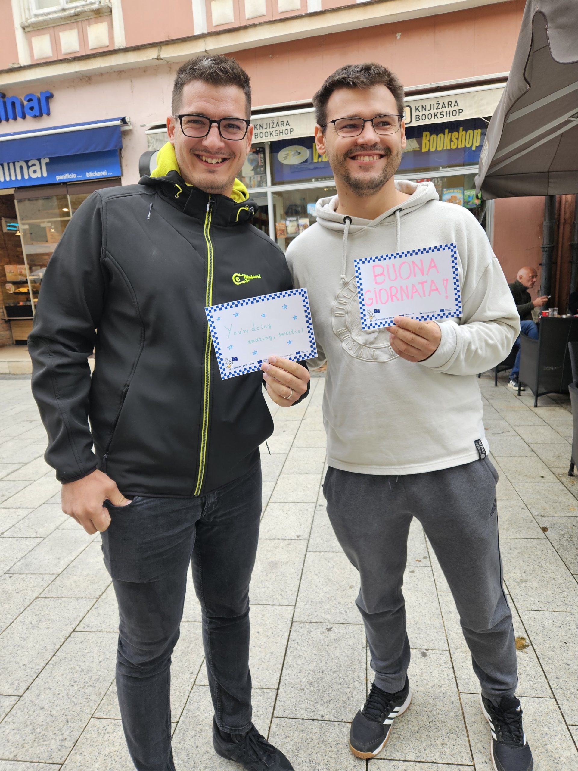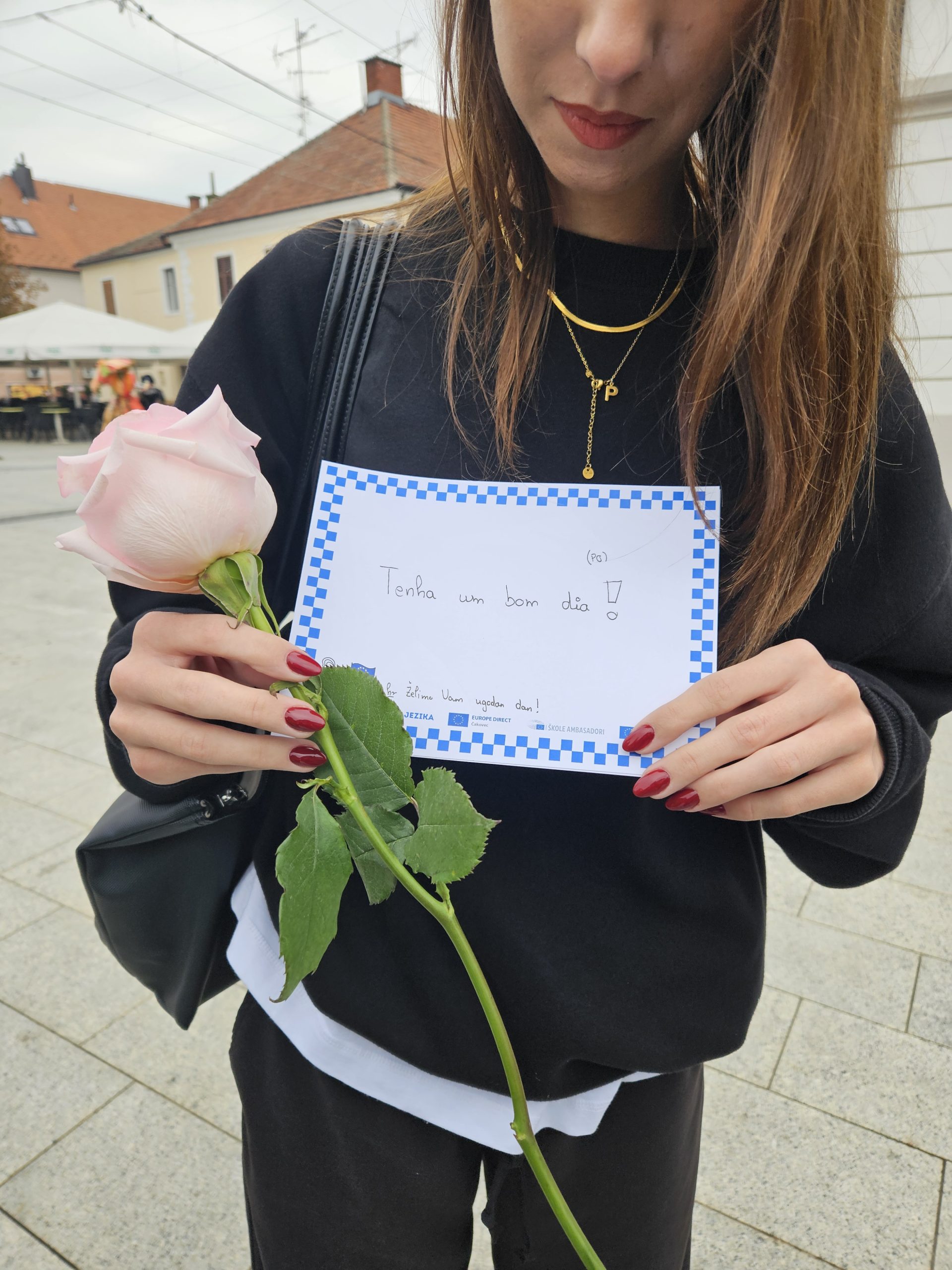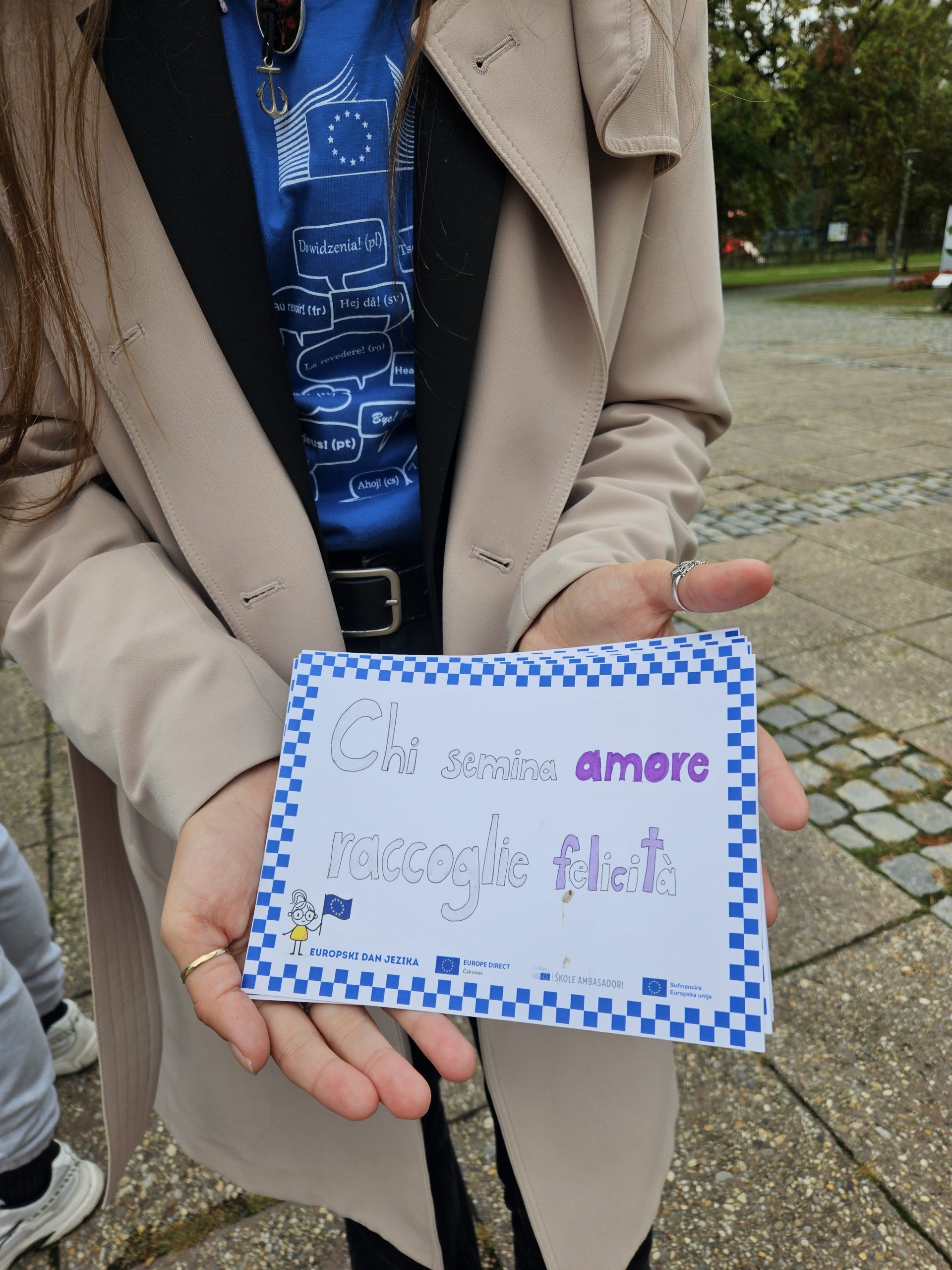 Prolaznici su s osmijehom primali kartice s porukama napisanima na jezicima poput engleskog, francuskog, njemačkog, talijanskog, češkog i mnogih drugih, prisjećajući se koliko su jezici važan dio identiteta i povezanosti među narodima.