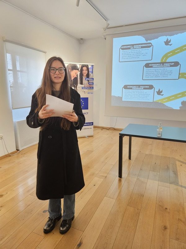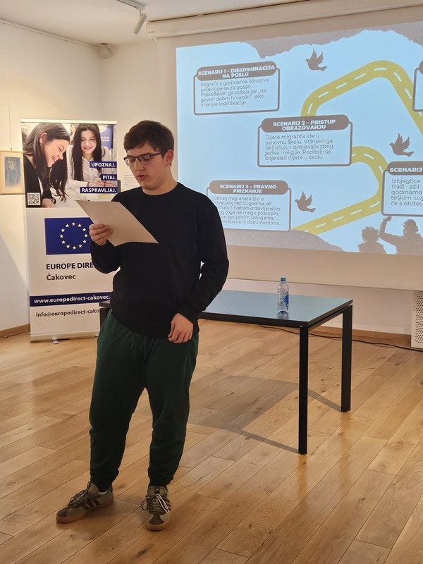 U završnom dijelu učenici su u grupama radili na konkretnim scenarijima koji su obuhvaćali situacije diskriminacije na poslu, teškoća u pristupu obrazovanju, problema s državljanstvom, govora mržnje na internetu i prava na azil. Zadatak je bio prepoznati koja su prava povrijeđena i predložiti moguća rješenja, čime se kod mladih poticalo kritičko mišljenje, empatiju i razumijevanje da svatko ima ulogu u zaštiti dostojanstva drugih. Program je pokazao koliko su mladi spremni otvoreno razgovarati o ljudskim pravima, solidarnosti i ulozi Europske unije u njihovoj zaštiti, te potvrdio važnost uključivanja mladih u rasprave o društvu u kojem žele živjeti.